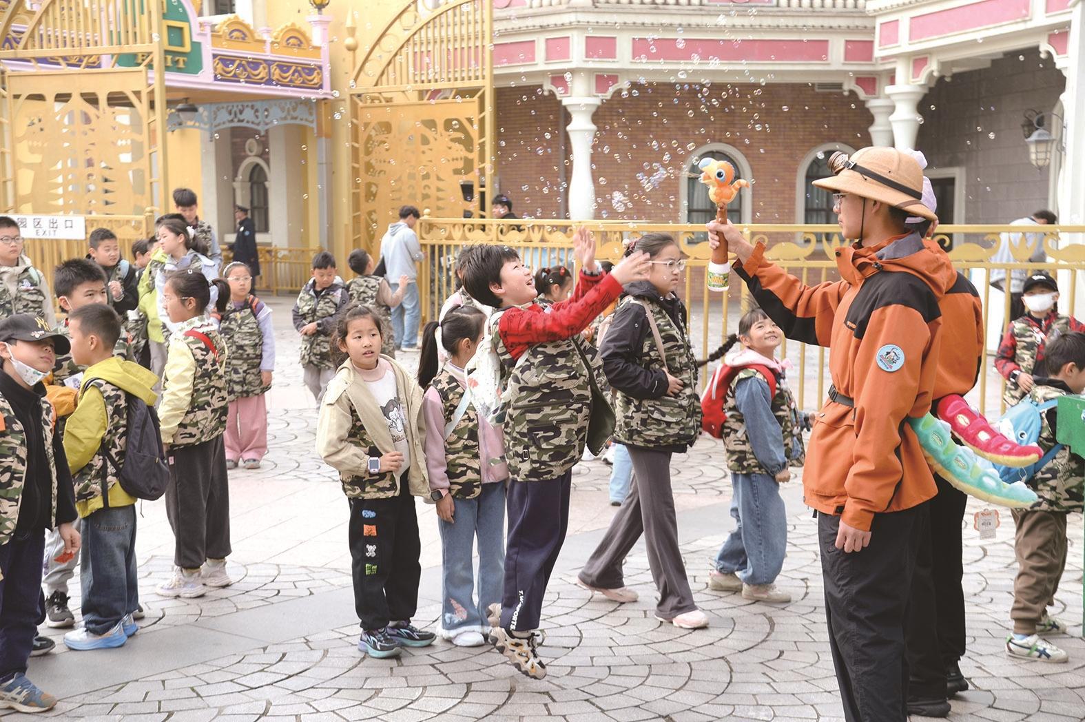 本报讯(周洁 夏晨希) 4月1日8时,来自扬州、无锡及常州本地的5支研学团队就陆续抵达中华恐龙园幸福大门,孩子们背着包、满脸期待地在老师的带领下有序签到。